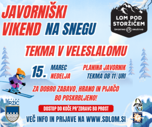 Športno društvo Lom pod Storžičem v nedeljo, 15. 3. 2026, organizira Javorniški vikend na snegu in veleslalom.